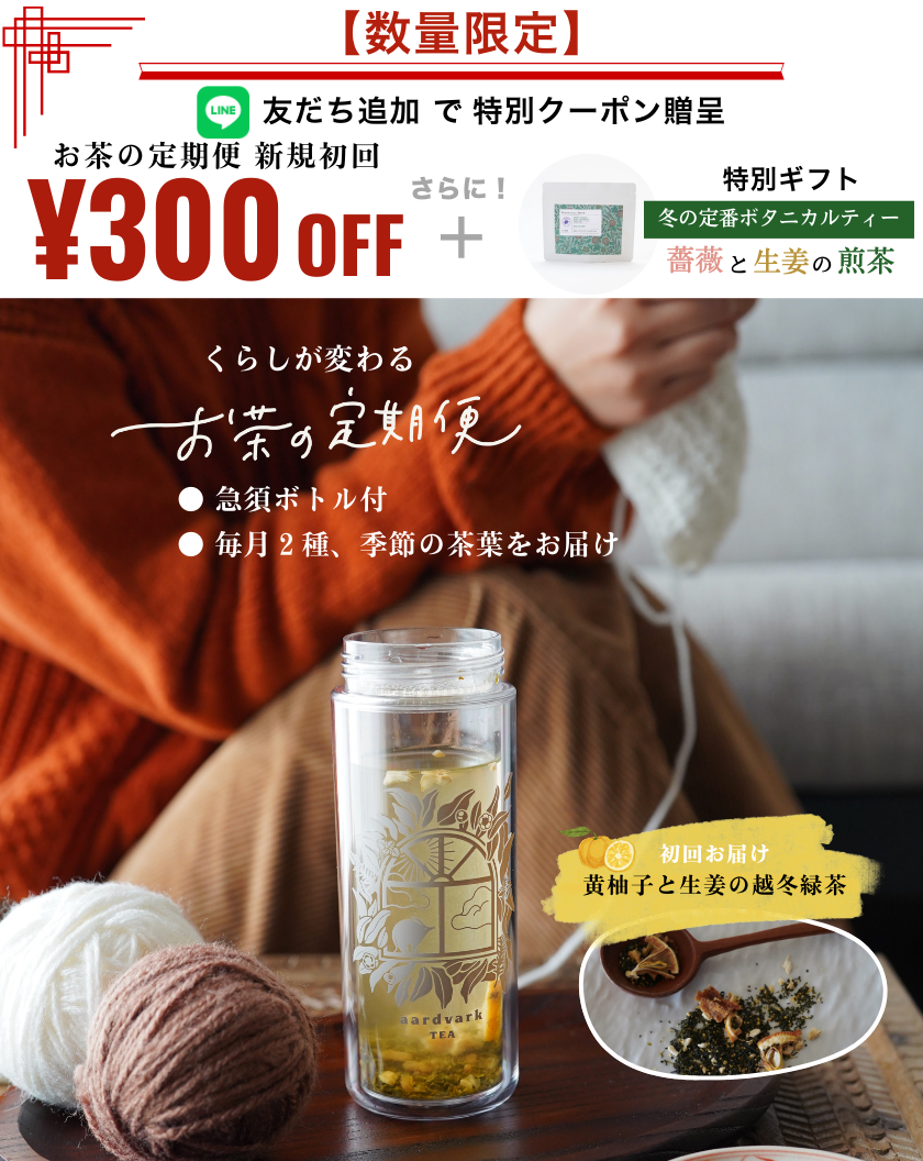 aardvark TEAの定番商品と定期便限定、季節限定のお茶から毎月2種をセレクトしお届けします。